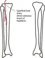 The sural artery flap is a Type A fasciocutaneous flap based on the sural artery direct cutaneous branch of the popliteal artery. The pedicle is 3 cm long and has a diameter of 1.4 mm. It is located between the popliteal fossa and the midposterior leg between the medial and lateral heads of the gastrocnemius muscle. The flap can measure 15 x 6 cm and may include the sural nerve as a neurosensory flap. Use this flap for wounds around the knee and upper leg.