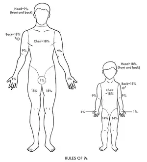 Estimate the burn area, including the back, by using the rule of 9s (patient’s palm is 1%).