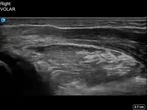 Record a 4 second video while slowly sweeping across the volar (palmar) aspect of the distal forearm until the metaphysis of the distal ulna is in the field of view.