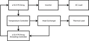 The PV material of choice is amorphous silicon and this is due to its properties. Firstly amorphous silicon suffers from the Staebler-Wronski Effect (SWE). When amorphous silicon is exposed to sunlight, a greater number a recombinations are formed which causes a higher defect density which is known as the SWE. This lowers the efficiency of the cells. The thicker the material the greater the probability of recombination which is the reason amorphous silicon cell is only 200-500 nm thick. However, if you anneal the cells to 150 C for 4 hours you can return the cell efficiency to its initial state. The cells anneal very slowly at 25 C.[4] Amorphous silicon, like all cells' efficiency degrades with temperature, but amorphous silicon only degrades at 0.1%/C which is lower than most other cells. This makes a prime option for PVT.