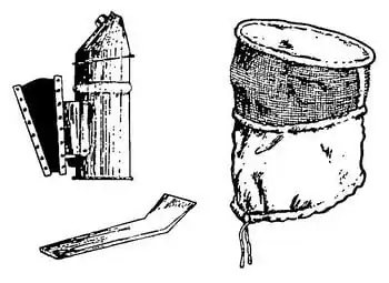 A beekeeper uses a smoker to produce cool smoke to calm the bees. The smoker consists of a fuel box containing smouldering fuel (for example dried cow dung, hessian, or cardboard) with a bellows attached. The beekeeper puffs a little smoke near the entrance of the hive before it is opened, and gently smokes the bees to move them from one part of the hive to another.