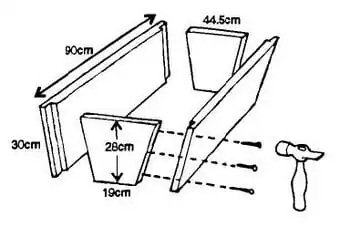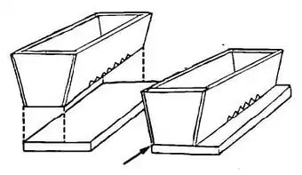 | Figure 2: A Kenya top-bar hive. This hive is suitable for African bees, but may need adjusting for Asian or European use. Any wood that is resistant to sun and rain and will not warp is suitable. (Drawing from Beekeeping for Beginners (1989) courtesy of GRATIS) |