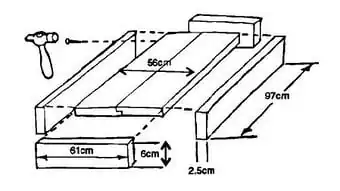 The only items in the top-bar hive which need to be built with precision are the top bars themselves; they must provide the same spacing of combs within the hive as the bees would use in their natural nest. The natural comb spacing is the distance between the centres of adjoining combs, and this spacing will depend upon the species and race of honey bees which are being used. As a very general guide, Apis mellifera of European origin need top bars 35mm wide, Apis mellifera in Africa need 32mm, and Apis cerana in Asia need 30mm. The best way to determine the optimum width is to measure the spacing between combs in a wild nest of the same bees. The volume of the brood box should equate roughly with the volume of the cavity occupied by wild-nesting honey bees.