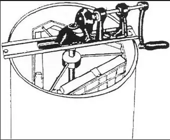 The most common traditional methods of honey extraction are squeezing or burning the combs. Burning the honeycomb is wasteful and makes the quality of both the wax and the honey inferior; it should be avoided at all costs. If your quantity of honey or financial resources are small, then squeezing the honey out by hand is probably the most viable option. The honey extracted by this method will have to be strained through several increasingly finer meshes to remove any bits of wax or debris, ending with something like muslin cloth. It is very important that this procedure be carried out hygienically, and that the honey is not left exposed to the air, where it will pick up moisture and deteriorate. Another good way of extracting honey from top-bar or movable frame hives is a radial or tangential extractor. This is a cylindrical container with a centrally-mounted fitting to support combs or frames of uncapped honey, and a mechanism to rotate the fitting (and the combs) at speed. The honey is thrown out against the side of the container and runs down to the bottom, where it is collected and then drained off with a tap. Most manufactured extractors are made to hold frames and have to be adapted to take comb from top bar hives. This is usually done by making wire baskets to hold the comb. The baskets can either lie flat horizontally, or be attached to the vertical frames and sit tangentially within the container. Top-bar combs in tangential extractors have to be spun twice, once on each side, to extract all the honey.