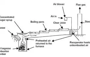 The boiling pan is located on top of a furnace that uses sun-dried bagasse, from the crushing operation, as fuel. Further clarification can be undertaken by adding a small amount of vegetable or chemical matter that coagulates during heating, trapping particles and contaminants and bringing them to the surface during boiling. This 'scum' can then be skimmed off and discarded.