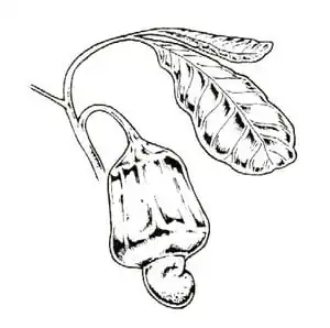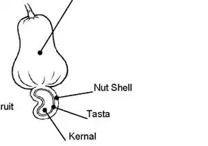 The cashew fruit (figures 1 and 2) is unusual in comparison with other tree nuts since the nut is outside the fruit. The cashew apple is an edible false fruit, attached to the externally born nut by a stem. In its raw state, the shell of the nut is leathery, not brittle. It contains the thick vesicant oil, CNSL, within a sponge-like interior. A thin testa skin surrounds the kernel and keeps it separated from the inside of the shell. The primary products of cashew nuts are the kernels which have value as confectionery nuts. Cashew nut shell liquid (CNSL) is an important industrial raw material for resin manufacture and the shells can be burned to provide heat for the decorticating operation.