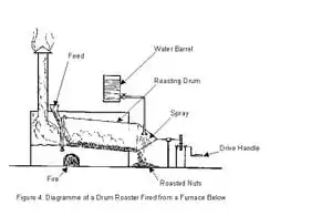 • Drum roasting: The idea of continually feeding the nuts into a rotating drum over a fire developed from the pan method. A slight horizontal slope in the mounting ensures the movement of the nuts through the drum. The drum is pierced so that the flames touch the nuts and the smoke is controlled by a hood and chimney arrangement. The nuts are dowsed using a continuous spray.