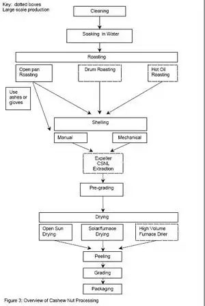 The shell can be cracked either manually, using a hammer, or mechanically. Manually operated blade openers (as listed in the supplier's section) are relatively inexpensive, however the more successful mechanical methods depend on the nuts having passed through the 'hot oil' CNSL extraction operation. Care must be taken not to break or split the kernel at this or subsequent stages as whole kernels are more valuable than broken ones. Once the kernel is removed from the shell, it is dried, the testa is peeled off and the kernel is graded. Figure 3 gives an overview of cashew nut processing and the various choices in methods.