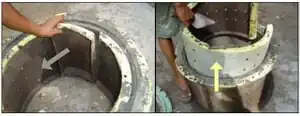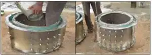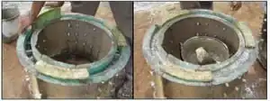 If rapid hardening cement was used, the mould can be removed after 24 hours. Special care should be taken to remove the moulds from the concrete rings. Inner mould should remove first to minimise possible damage.