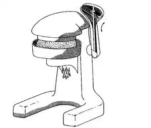 In the case of citrus, this is easily done with a hand presser or a revolving citrus 'rose', Figure 1. Other fruits such as mango, guava, soursop, etc require pulping - that is, after peeling and stone removal, the flesh of the fruit is pushed through a perforated metal plate. For this process, there is a range of equipment available from the small 'Mouli Legume' and several versions of hand-powered pulper/sieves, all of which force the fruit pulp down through interchangeable metal strainers, Figures 2 and 3.