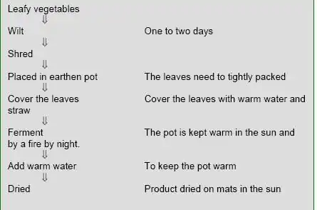 The shredded leaves are tightly packed in an earthenware pot and warm water (at about 30oC) is added to cover all the leaves. The pot is then kept in a warm place. After five to seven days, a mild acidic taste indicates the end of fermentation and the gundruk is removed and sun-dried. This process is similar to sauerkraut production except that no salt is added to the shredded leaves before the start of gundruk fermentation. The ambient temperature at the time of fermentation is about 18oC.