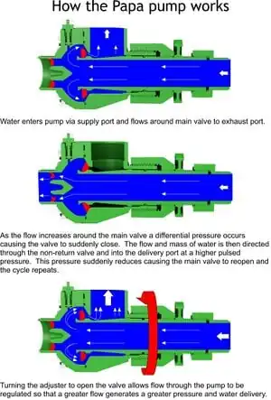 A pressure vessel installed on a tee connected to the delivery port of the pump provides the pulsed flow accumulation means. This unique technology and design dramatically reduced the weight, manufacturing cost and number of components required - as well as providing an overall improvement in efficiency. Additional patents granted to Selwyn have since been developed by UK companies Papa Ltd and Water Powered Technologies Ltd[3] of Bude, Cornwall, further enhancing the technology to include a composite material injection-moulded pump allowing for relatively low cost mass production whilst maintaining high strength, low weight and high performance previously only attainable with metal units.