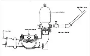 The air chamber is a vital component. It may improve the efficiency of the process by allowing delivery to continue after the delivery valve has closed. It is also essential to cushion the shocks that would otherwise occur due to the incompressible nature of water. If the air chamber fills with water completely, not only does performance suffer, but the hydram body, the drive pipe or the air chamber itself can be fractured by the resulting water hammer. Since water can dissolve air, especially under pressure, there is a tendency for the air in the chamber to be depleted by being carried away with the delivery flow. Different hydram designs overcome this problem in different ways. The most simple solution requires the user to stop the hydram occasionally and drain the air chamber by opening two taps, one to admit air and the other to release water. Another method on more sophisticated hydrams is to include a snifting valve which automatically allows air to be drawn into the base of the air chamber when the water pressure momentarily drops below atmospheric pressure. It is important with such units to make an occasional check to see that the snifting valve has not become clogged with dirt and is working properly.