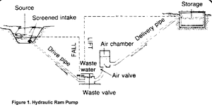 Figure 1 illustrates the hydraulic ram; initially the impulse valve (or waste valve since it is the nonpumped water exit) will be open under gravity (or in some designs it is held open by a light spring). The water will then flow down the drive pipe (through a strainer) from the water source. As the flow accelerates, the hydraulic pressure under the impulse valve and the static pressure in the body of the hydram will increase(Figure 1B) until the resulting forces overcome the weight of the impulse valve and start to close it. As soon as the valve aperture decreases, the water pressure in the hydram body builds up rapidly and slams the impulse valve shut. The moving column of water in the drive pipe is no longer able to exit via the impulse valve so its velocity must suddenly decrease; this continues to cause a considerable rise of pressure which forces open the delivery valve to the air-chamber.