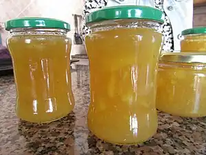 The 'end point' is reached when the total soluble solids is up to 70%, this is measured with a refractometer. (In most countries the legal minimum sugar levels in jam, are 65% for jam in hermetically sealed jars, and 68.5% for jam in non air tight containers). 70% gives a safety factor. Jam with over 70% sugar can give problems during storage, as sugar will recrystallise out into large chunks. The 'end point' is usually reached around 106-108°C (depending on barometric pressure and height above sea level). When the jam has nearly reached this temperature samples are taken and tested on a refractometer, the sample must be cooled before being measured. This can be done by smearing on a cold dry plate or saucepan lid. All implements used to take the sample must be dry, otherwise the reading will be reduced. It is important to stir the jam at all times otherwise burning will occur at the bottom of the saucepan, causing off flavours and discoloration. When the 'end point' has been reached the jam should be filled into jars which have been cleaned and then steamed to sterilise them, and are still hot so that they do not crack. The jars should be filled as quickly as possible so that the jam is not heated for longer than necessary, or recontaminated because it has cooled down before the jars are sealed. The lip of the jar should be clean and dry (wipe with clean tissue paper) before placing the lid on it. The filled jars can be placed in water to cool down the jam so that it does not keep cooking in the jar, the water level should be kept below the lid of the jars.