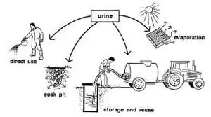 If the use of urine is not culturally acceptable in food production, the urine can also be added to compost piles to assist the decomposition process. As mentioned the urine can also be soaked away, evaporated or discharge to a plant box connected directly to the toilet.