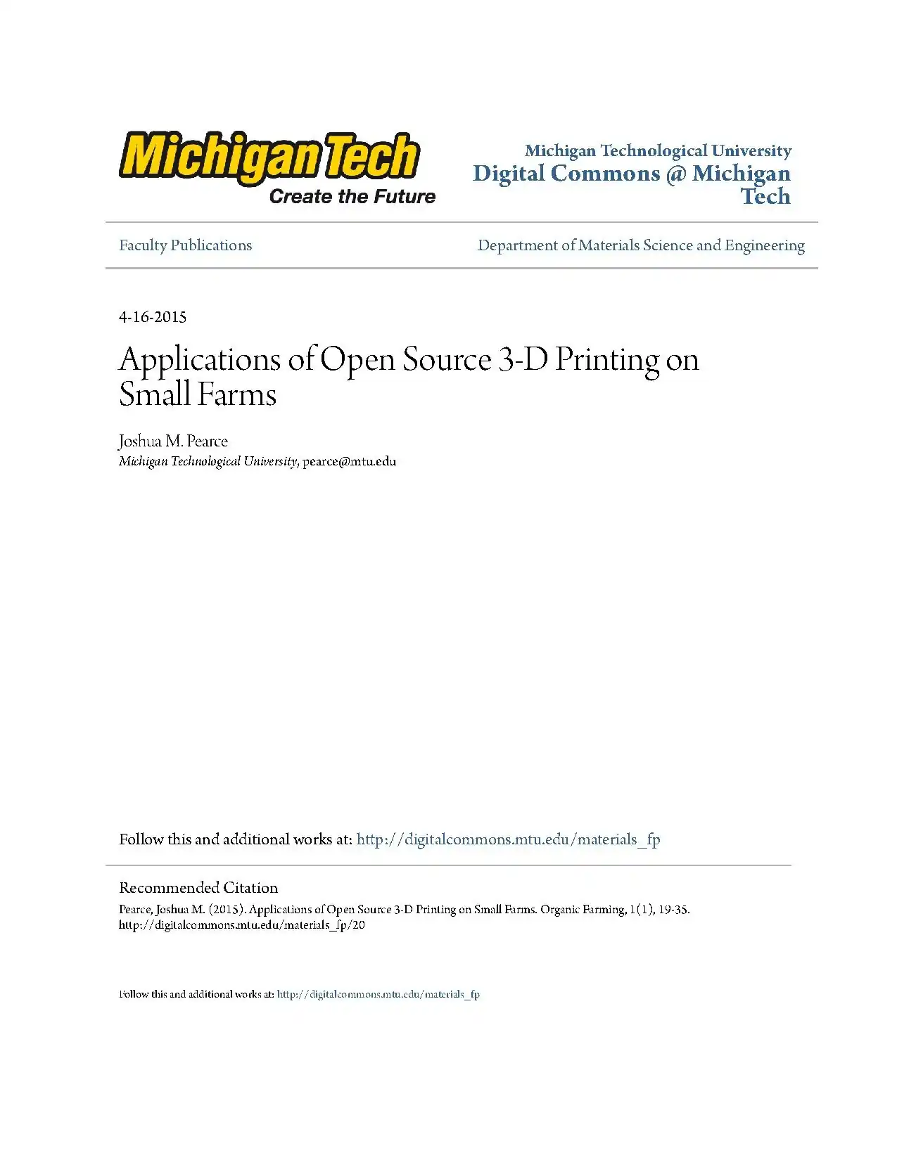 - ↑ Article: Michigan Techonological University, Applications of Open Source 3-D Printing on Small Farms (2015) Available: