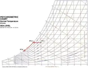 The Psychrometric Chart is a vital tool in evaluating any air conditioning system. Air contains water vapour as well as other gases and as as air is cooled or heated the relative humidity and moisture content of the air changes. The Psychrometric chart plots the relative humidity and the enthalpy of humid air against the temperature and the moisture content so that air conditioning processes can be modelled by drawing lines on the chart.