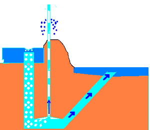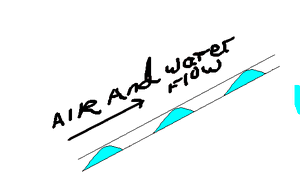 The lifting action of the pump up the pumping tube occurs mostly in the slug flow regime. In slug flow, the liquid and gas separate into different layers occupying nearly the entire cross section of the tube, as shown below.