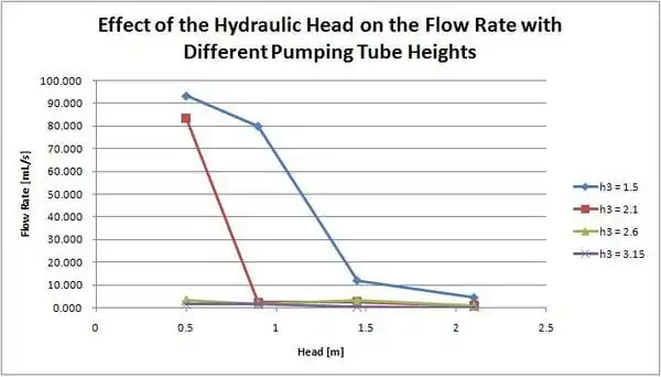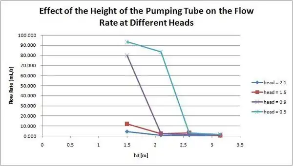 In this test, two variables were changed, the hydraulic head on the pump, and the height of the pumping tube.