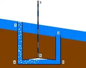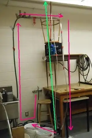 Based on the success of other similar pilot projects,[2] a proof of concept model was constructed. The materials listed here are for the construction of a model, which can be used for small scale applications, such as those described in the Existing Pumps section below, or for further testing. The plastic tubing described here are flexible plastic tubing, which is useful for testing, as it can be bent to the correct height and reused for different tests, however solid PVC piping could also be used, and would be more practical to implement in a non-test situation. (See the Testing section.)