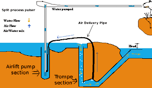 The pulser pump simply uses the trompe part to power the airlift part. A video explaining the pump can be seen here.