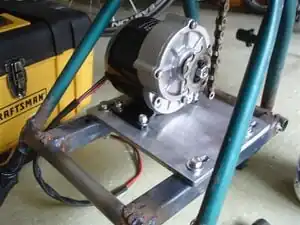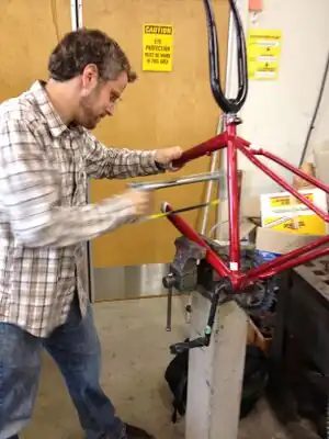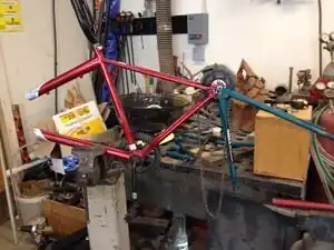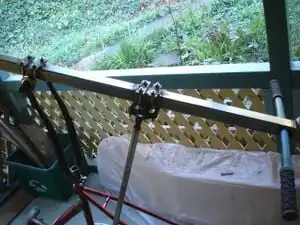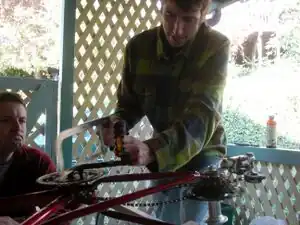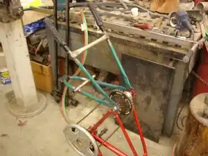 To build the frame you will need two bicycles. At least one should have functionally rotating pedals, wheels, and crank at the bottom bracket. The other bicycle need only contain a frame and handlebars; it will be referred to as the "scrap bicycle" and used as framing material. For the frame, most of the support pieces are welded to the main frame. The rear support is mounted to the rear axle position thereby two rear bicycle frame components are mounted to the same rear axle.