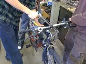 Disassemble one bicycle down to the frame by removing the brakes, shifters, derailleurs, handlebars, front forks, and wheels. Leave at least one pedal on, noted in the next step. Separate the front and rear wheels from their hubs by cutting and removing their spokes. These will be used later.