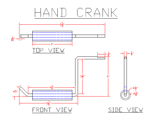 The first hand crank that was tested was a three foot steel rod that was composed of five angles. The design of this rod was to allow the user the ability to use two hands while cranking the generator while another student held the drill. During the testing of the rod it was realized that minute electrical generation was occurring due to the large spin radius. The increased spin radius greatly decreased the amount of revolutions the user could generate in a given time.