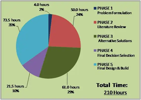 The following pie chart represents the time spent on the design project, time spent in each phase is displayed as well as total time. The time spent on the entire design process for the educational kit is also broken into percentages, displayed the proportion of time spent on each phase. The pie chart (Figure 8) represents time spent for the entire team.