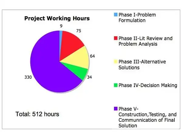 The total number of combined hours that Energy-Caters contributed to completing Modeling Renewable Energy, as seen in Figure 3, is 512 hours. The design process was divided into five phases: Problem Formulation, Problem Analysis/Literature Review, Alternative Solutions, Decision Process, and Construction and Testing of the final solution. Details of each phase are located in the linked document.