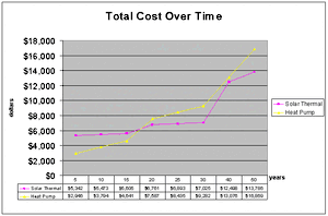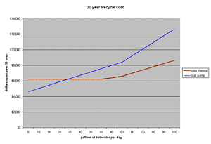 A solar thermal system typically lasts about 30 years. This chart shows what each system will cost over that period of time depending on daily hot water usage. To find your daily hot water usage fill out the spreadsheet provided under references. As you can see at about 25 gallons the lines cross and solar thermal becomes more cost effective over its 30 year life-cycle. In the 30 year life of a solar thermal system, because water heaters typically only last 10-15 years, the heat pump water heater or the water heater you had originally installed for your solar thermal system would need to be replaced once or twice. The cost of this replacement is all factored into the life-cycle cost of this chart.