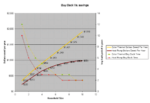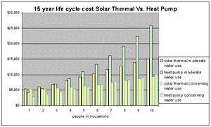 A standard water heater lasts about 10-15 years. A solar thermal system however can last up to 30 years. We used a 15 year total life cycle cost of unit cost, installation, maintenance costs, and annual energy costs to find these results. These results are based on household size and how much water the people in that house are using. To attain this data we preset the water usage to what we considered a "moderate water usage" and tracked that data for each household size and then to a "conservative water usage" to track that to different household size. "Moderate water usage" mode assumes that the household has a dishwasher, a laundry machine, and that each family member does 1 load of laundry per week. It also assumes that each person takes 10 minute showers. Conserving mode assumes that the household does not have or does not use a dishwasher or laundry machine, and that each person in the household takes 5 minute showers. The different levels of cost for each system are then determined by how many people are in the household. This graph is also preset to some other variables. For example, it is assumed that a high efficiency gas water heater is used for a backup on the solar thermal. It is also assumed that the user lives in the Humboldt area as the graph was set to this areas climate specifications.