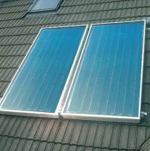 Flat Plate Collectors are sealed rectangular boxes with heat absorbing metal sheets next to small tubes of water or coolant. This liquid is moved through the house to the heat exchanger near/in the water tank. A schematic of this system can be found here.