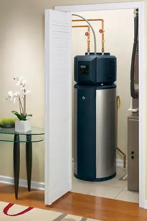 Air source heat pump water heaters come as either a prepackaged unit which includes a tank, and an electric component heating unit, or as a stand alone unit that can be hooked into a preexisting water heater tank. For our project we chose the GE hybrid heat pump water heater because it had the highest energy factor efficiency rating and the installation and unit cost was fairly low compared to units that don't come as a package.