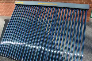 Evacuated Tube Collector are layered glass cylinders that absorb sunlight and heat water in the center tube which is in a vacuum. The lack of pressure inside to tubes allows the boiling of water at a much lower temperature. Heat from the boiling water in the tubes is transferred to another liquid. This heated liquid travels through a house to a heat exchanger near/in the water tank. The heat exchanger again moves the heat out of the liquid and in to the water in the tank.