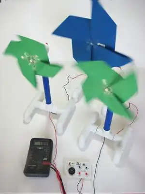 The instructor then connects three turbines in series modeling a wind farm as shown in Figure 4. The wind farm will be attached to a board that can flash lights or play music when the power supply is sufficient (1.2 volts).