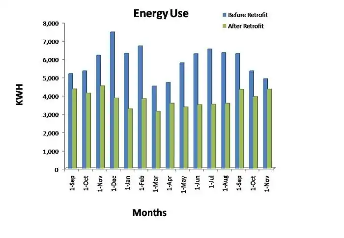 Figure 4 shows electric use for the 15 months before the retrofit (blue bars), and the 15 months after the retrofit (green bars). As the graph shows the energy retrofit decreased electric consumption. The electric use varies greatly because on some months the American Cancer Society has large donation events such as the Relay for Life and the organizers spend more time in the office.