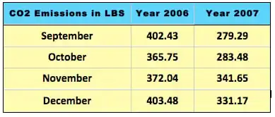 RCEA projected the CO2 emissions to be reduced by 2,709 pounds per year. That actual number of reduction was 932.2 pounds per year. In Figure 3 the CO2 emissions are show in a table for the years of 2006 and 2007. Figure 3 shows an average of 77 pounds of CO2 per month.