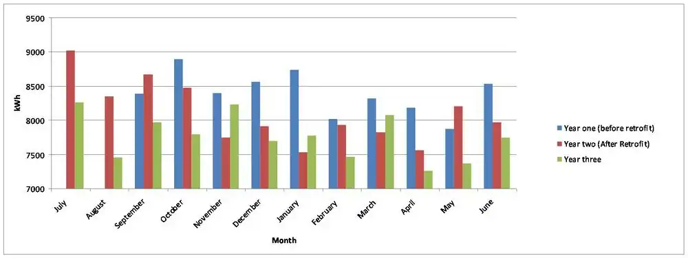 The outcome of the retrofit was overall savings. Before the retrofit the average monthly kWh usage was 8,451 kWh, and after the average was 7,917 kWh. This amounts to 535 kWh saved per month, and 6,420 kWh yearly. That amount of energy translates into 3,364lbs of CO2 saved per year. This information was obtained by comparing two consecutive years, one year before the audit, and one year after. The results are shown in Table 1.1