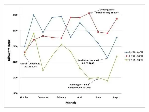 One of the first retrofits suggested by RCEA to the store owner was to add a device to the vending machines located at the business called a Vending Miser/Snack Miser.[5] Scrapper's Edge previously had vending and snack machines that increased the business' energy consumption. The Vending Miser could potentially reduce the machines consumption of energy by an average of forty-six percent.[6] Kirtley went ahead with the installation of the Vending Miser and Snack Miser, but eventually removed the machines from the business after the energy controllers were installed. Below in Figure 4, are labels that outline the installation and removal of the Vending/Snack Misers and the vending machines prior to and after the retrofit. Kirtley did notice a reduction of energy usage in her monthly bill compared to the time before the vending machine controllers were installed, but felt that the vending machines were not producing enough profit to make up for energy costs.