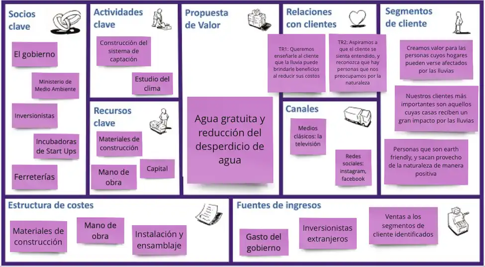 Dentro del modelo de negocios CANVA, se incluyen distintos elementos esenciales que deberían tomarse en cuenta a la hora de la generación de estrategias. Podemos observar que, para este proyecto, los socios clave son principalmente: el Gobierno (Ministerio del Medio Ambiente), incubadoras de StartUps, ferreterías y por supuesto los inversionistas. Asimismo, notamos que la construcción del sistema de captación de aguas lluvias y un estudio del clima son las actividades clave a realizar para tener un mayor conocimiento de cómo proceder con la implementación del proyecto. Estas, junto a los recursos clave para crear físicamente el producto principal, que serían los materiales de construcción (barriles, tubos PVC, entre otros) y la mano de obra calificada, conforman un importante peso para la creación de la idea, pues suponen los primeros pasos de esta. Su principal propuesta de valor consiste en aprovechamiento positivo del agua de lluvia (gratis) y reducción de su desperdicio. De la anterior se parte para crear una relación con los clientes en la que queremos enseñarle que la lluvia puede brindarle beneficios al reducir sus costos básicos, por otra parte, también aspiramos a que el cliente se sienta entendido, y reconozca que hay muchas personas que se preocupan por la naturaleza. Los principales canales de distribución y promoción serían: medio clásicos como la TV, y las redes sociales, por ser un servicio se distribuiría en la locación de cada cliente. Debido al concepto primordial del proyecto, el CANVA da a conocer que los segmentos de clientes a los que se espera atender son personas earth friendly y usuarios afectados por las lluvias. Con respecto a la estructura de sus costes, estos serían aproximadamente: materiales de construcción, mano de obra, costo de la instalación y el ensamblaje. Por último, los ingresos serían principalmente percibidos por la venta del servicio.