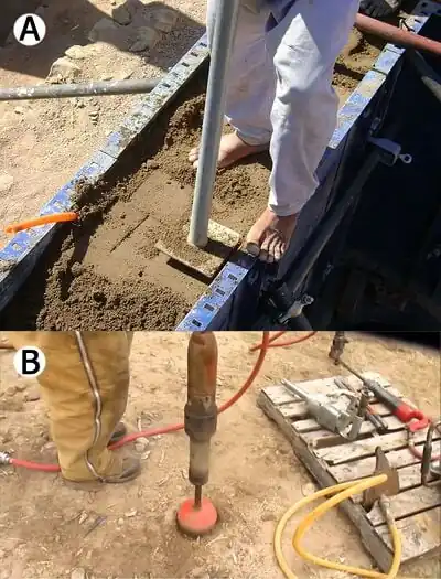 In modern variations of the method, rammed earth walls are constructed on top of conventional footings or a reinforced concrete slab base.