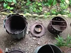 | This image shows the three pieces of the biochar stove. On the left is the compartment where the dried wood is placed and burned. The piece in the center of the image fits on top of the wood chamber, and acts as a small chimney for air to enter and escape. The piece on the right acts as a grill, on which a pot may be placed for cooking. | |
