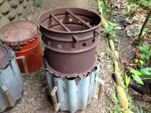 The biochar stove at Rancho Mastatal is used to create biochar and cook food. Biochar can be used to improve soil fertility while also sequestering carbon. Cooking with the heat produced makes the overall use of the stove more energy efficient. The biochar stove was made with paint cans, rebar, and zinc.