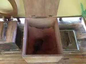 | From left to right this image displays the toilet, the sawdust compartment, and the lid to the second waste container. The toilet sits on top of one compartment that takes up half of the storage space. When it is full the toilet is moved to the compartment on the right. A lid is kept on the toilet box when it is not in use to help keep pests out of the compost. A generous amount of sawdust must be added after each toilet use to provide ample organic matter for the composting process to occur properly. | |