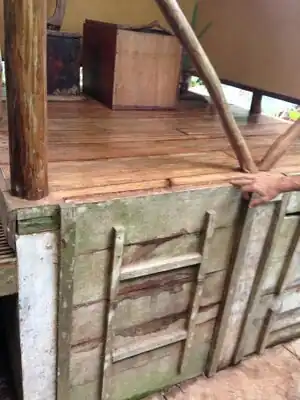 This image shows the gate to the left waste compartment. When it is full the toilet is moved to the right compartment, and the material in the left compartment is given time to fully compost. As the right compartment fills up, the left one has time to become compost and be used for gardening. When the right compartment fills up the toilet is switched back to the left compartment and the cycle repeats. |
