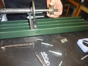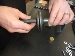 13. Insert the feed screw. Add the brass spacer, the tapered roller bearing, and the race to the hex-stock end of the feed screw.