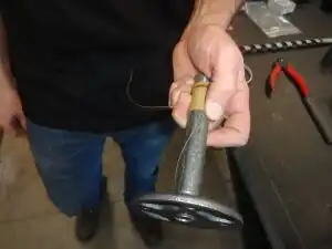 - (iii.) Hold the wire parallel alongside the tube—free end of the wire directioned toward the feeder end and positioning the identified spot (4-6") of wire about 1/8" or less from the tube threads at the nozzle end.