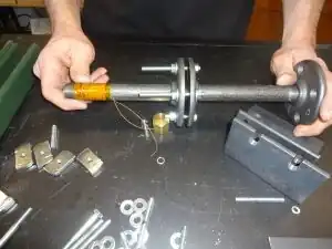 Before you begin this step, the barrel of recyclebot should be completely tightened onto the frame. The feed screw, when inserted into the barrel should freely move and should spin when rotated. The brass spacer used in this step is made by turning it on a lathe; this can be made at a local machinist shop. (See Photo 20)